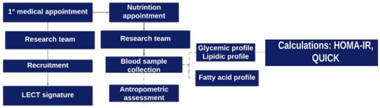 Participant recruitment took place during the first consultation with the surgeon. The patients underwent anthropometric evaluation on the day of the consultation with the dietitian, and the blood sample was collected. The study design is presented in Figure 1.