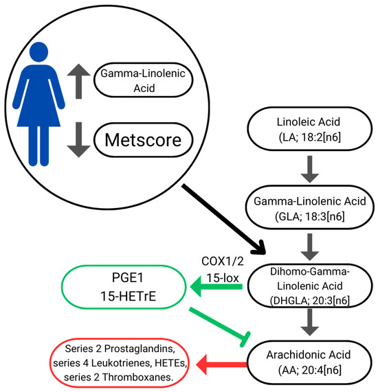 Lower cardiovascular risk may also be associated with higher GLA values due to its beneficial health effects arising mainly from the conversion of GLA into Dihomo-Gamma-Linolenic (DHGLA) which gives rise to metabolites such as cyclooxygenase 1/2 (COX1/2). The COX1/2 increases prostaglandin series 1 (PGE1) and 15-lipoxygenase (15-Lox) forming 15-(S)-hydroxy-8,11,13-eicosatrienoic acid (15-HETrE). DHGLA-derived metabolites suppress inflammation, promote vasodilation, lower blood pressure, and exert antineoplastic effects [38]. Furthermore, both PGE1 and 15-HETrE antagonize the synthesis of pro-inflammatory metabolites derived from Arachidonic Acid (AA), such as series 2 Prostaglandins, series 4 Leukotrienes, HETEs, and series 2 thromboxanes (Figure 2) [48]. GLA is commonly available as a dietary supplement; however, its efficacy in attenuating inflammation through dietary intake remains controversial [49,50,51]. Further research is required to clarify its therapeutic potential in this context [52].
