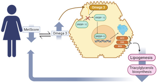 The possible mechanisms for the protective effects of omega 3 PUFA on MetS are related to reduced synthesis of triacylglycerols and LDL-c in the liver, preventing dyslipidemias [55]. Omega-3 can reduce the synthesis of fatty acids in the liver by suppressing the nuclear abundance of the transcription factor SREBP-1c that promotes the activation of essential genes in the regulation of lipogenic enzymes, acetyl-CoA carboxylase (ACC) and fatty acid synthase (FAS), which are responsible for catalyzing lipogenesis, increasing the efflux of serum FFAs for the formation of triacylglycerols (Figure 3) [55,56].
