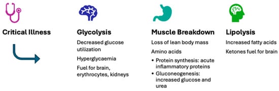 Severe illness triggers major metabolic and endocrine disturbances that closely interact with changes in the autonomic and immune systems. During the acute phase, there is increased catabolism, insulin resistance, and changes in nutrient substrate utilization [4]. These adaptations help ensure cellular energy sufficiency, support the body’s defense mechanisms, and promote survival (Figure 1). However, these disturbances can become harmful after the acute phase [5]. Critically ill children often experience feeding difficulties due to perceived feed intolerance and interruptions [6], resulting in undernourishment and a cumulative macronutrient deficit during their PICU stay [7].