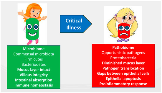 EN further supports the preservation of microbiome diversity during critical illness by countering the effects of luminal nutrient scarcity, which can lead to a shift toward a pathogenic microbiome, or pathobiome. This preservation is essential for maintaining villous integrity, facilitating intestinal absorption, and supporting immune homeostasis [117]. Additionally, the gut microbiota affects the interactions between the central and enteric nervous systems, known as the gut–brain axis [118], by connecting the brain’s emotional and cognitive centers with the functions of the peripheral intestines [119]. The gut–lung axis has recently been recognized as a key factor in the pathophysiology of ARDS, emphasizing the bidirectional communication that involves bacterial and immune interactions between the gut and lungs within their respective environments [120]. A pathobiome, characterized by reduced Firmicutes and Bacteroidetes and increased Proteobacteria, is associated with poor revascularization, a compromised mucus layer, and increased pathogen translocation through epithelial gaps. These changes contribute to epithelial apoptosis, impaired nutrient absorption, and pro-inflammatory response, resulting in gastrointestinal disturbances (Figure 3).