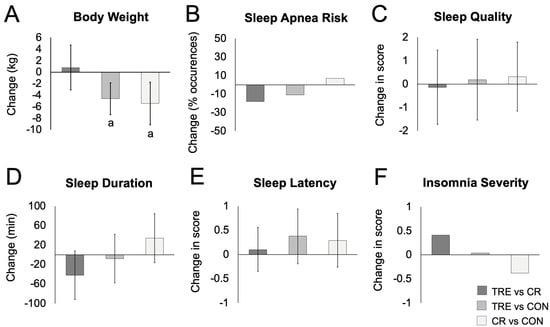 Change in body weight and sleep parameters between TRE, CR, and control groups by month 12. Abbreviations: CON: control group, CR: calorie restriction group, TRE: time-restricted eating group. (A) Change in body weight between groups. (B) Change in sleep apnea risk between groups. (C) Change in sleep quality score between groups (measured by Pittsburgh Sleep Quality Index (PSQI)). (D) Change in sleep duration between groups. (E) Change in sleep latency score between groups. (F) Change in insomnia severity score between groups (measured by the Insomnia Severity Index (ISI)). Means were estimated using an intention-to-treat analysis using a linear mixed model with 95% CIs for each parameter from baseline by diet group. a Indicates statistical significance using Bonferroni-adjusted 2-tailed p < 0.017. All other comparisons were not significant.