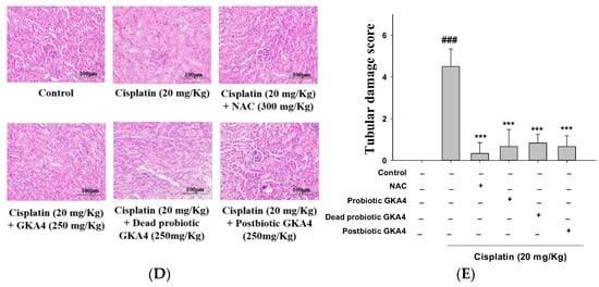 The experimental design is depicted in Figure 1A. BUN and CRE serve as critical markers for assessing kidney function. Demonstrated in Figure 1B,C is the inhibitory effect on CRE and BUN levels following cisplatin-induced AKI through the oral administration of GKA4, dead probiotic GKA4, and postbiotic GKA4 (250 mg/kg). In current cancer treatment practices, N-acetylcysteine (NAC) is used to alleviate adverse effects and boost the efficacy of anticancer medications. Therefore, the outcomes indicate that pretreatment with GKA4, dead probiotic GKA4, and postbiotic GKA4 contributes to improved kidney function during cisplatin-induced AKI.