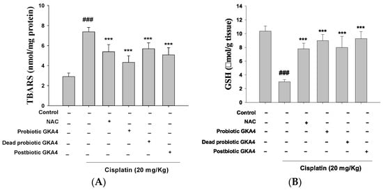 Our current understanding of the molecular pathways implicated in averting cisplatin-induced AKI remains limited, and effective preventive measures are lacking. The administration of cisplatin has been shown to instigate oxidative stress within kidney tubular cells, subsequently elevating levels of apoptosis and autophagy [37]. Oxidative stress, direct cytotoxicity, and mitochondrial dysfunction may contribute to tubular cell damage. The progression of AKI involves the apoptosis of renal tubular epithelial cells. Thus, addressing tubular injury may be an essential therapeutic focus in the management of cisplatin-induced AKI [29]. Oxidative stress emerges as a key element in cisplatin-challenged AKI. ROS production induced by cisplatin occurs through three mechanisms: interaction with thiol-containing molecules like GSH, disruption of the mitochondrial respiratory chain, and activation of cytochrome P450 (CYP) enzymes leading to ROS generation in microsomes. These processes ultimately result in renal tubular apoptosis [30]. Research indicates that free radicals are produced in large quantities during cisplatin-induced kidney injury, with ROS being a major factor in the resulting acute damage and pathology. Cisplatin-induced oxidative stress has been evaluated using methods like MDA measurement, antioxidant enzyme activity (GPx, catalase, SOD), and GSH levels. Oxidative markers have recently been proposed for non-invasive early detection of cisplatin-induced renal injury. Urinary MDA levels rise within 24 h, suggesting their use as early markers of nephrotoxicity in clinical settings [37]. TBARS is an index of lipid peroxidation, playing a major role in cisplatin-induced nephrotoxicity. MDA serves as a marker for lipid peroxidation and assesses oxidative stress in various tissues. GKA4, dead probiotic GKA4, and postbiotic GKA4 administration resulted in elevated GSH levels and reduced MDA formation following cisplatin induction.