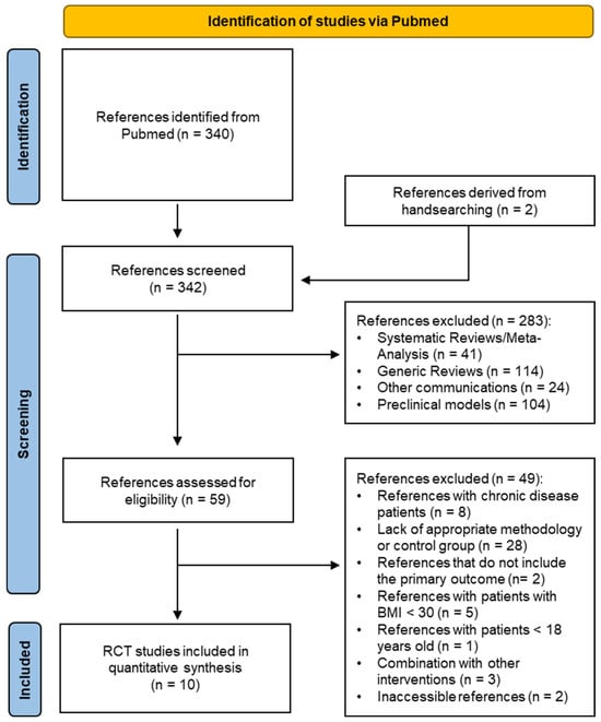 According to the exclusion criteria, 41 systematic reviews/meta-analyses, 114 generic reviews, 104 animal or in vitro studies, and 24 other communications were excluded. A total of 59 articles were then assessed for eligibility. Through careful screening of the full text of the articles, 49 records were excluded for the following reasons: inclusion of chronic disease patients in eight studies, lack of appropriate methodology or control group in twenty-eight articles, absence of the primary outcome in two studies, patients with BMI lower than 30 kg/m2 in five studies, one article concerning under-age patients, three articles concerning combinations with other interventions, and two inaccessible articles following a corresponding author request.