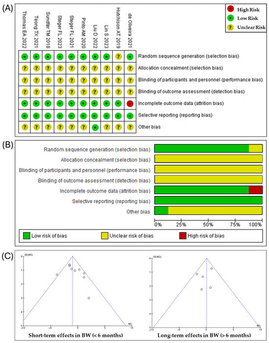 Nine out of the ten studies assessed focused on ponderal weight loss in obese patients who underwent interventions lasting less than six months [22,23,24,25,26,27,28,29,30]. The short-term effects of FBS on body weight is illustrated in Figure 3A. Both interventions led to weight loss, with a reduction of 5.5 to 6.5 kg observed at the six-month mark. However, the combined analysis of the nine studies (n = 565) revealed a statistically significant (p = 0.004) overall effect size (−0.94 kg [95% CI: −1.58, −0.31], indicating that FBS were more effective than CCR to reduce body weight. Although there was moderate heterogeneity (I2 = 42%), this variability was not statistically significant (p = 0.08).