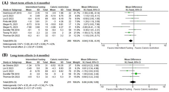 (A) Forest plot of the short-term effects (<6 months) of fasting based interventions versus continuous caloric restriction on body weight. (B) Forest plot of the long-term effects (>6 months) of fasting based interventions versus continuous caloric restriction on body weight [21,22,23,24,25,26,27,28,29,30].