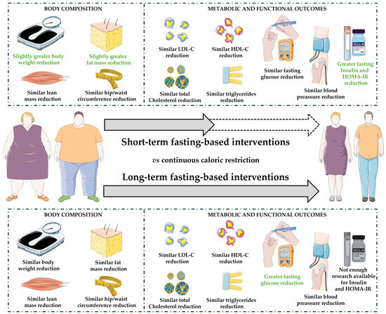 Representative illustration of the results obtained in the present meta-analysis on short- and long-term interventions based on fasting compared to continuous caloric restriction.
