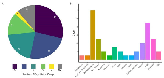 (A) The distribution of the number of psychiatric prescriptions that patients were prescribed simultaneously; the numbers in the pie chart are the number of patients on either 0, 1, 2, 3, or 4 psychiatric medications [64]. (B) Among the broad classes of drugs prescribed to patients in panel (A), benzodiazepines (gold bar) and selective serotonin reuptake inhibitors (SSRIs: purple bar) were most commonly used. Many other prescriptions were also prescribed in conjunction with benzodiazepines and SSRIs [64].