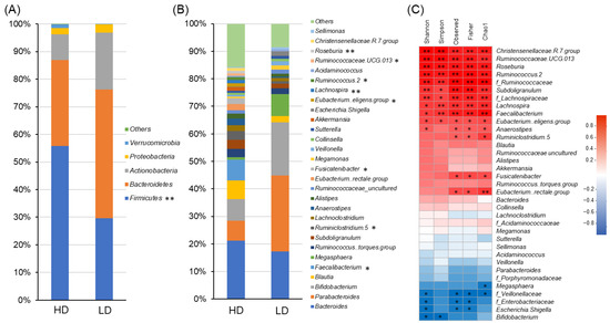 Intergroup comparisons of the gut microbiome (Figure 1 and Table S4) indicated that, at the phylum level, the occupancy of Firmicutes was significantly higher in the HD group than in the LD group (p = 0.008; Figure 1A). The HD group had a significantly higher presence of genera belonging to p_Firmicutes, such as Eubacterium eligens group, Fusicatenibacter, Lachnospira, Roseburia, Ruminococcus 2, Feacalibacterium, Ruminiclostridium 5, and Ruminococcaceae UCG 013 (at p = 0.020, 0.043, 0.005, 0.005, 0.020, 0.013, 0.043, and 0.029, respectively; Figure 1B). Correlations between the alpha diversity and genus and family level of the gut microbiome can be seen in Figure 1C. All diversity indices—Shannon, Simpson, Observed, Fisher, and Chao1—correlated with a nearly identical gut microbiome overall, indicating significant positive correlations between diversity indices and genera belonging to p_Firmicutes. This result is similar to the significant differences observed for several of the observed bacteria from genera belonging to the f_Ruminococcaceae and f_Lachnosperaceae, with significant positive correlations. However, g_Bifidobacterium, g_Escherichia–Shigella, which belongs to the f_Enterobacteriaceae, and f_Veillonellaceae showed significant negative correlations with some of the diversity indices, such as the Shannon index.