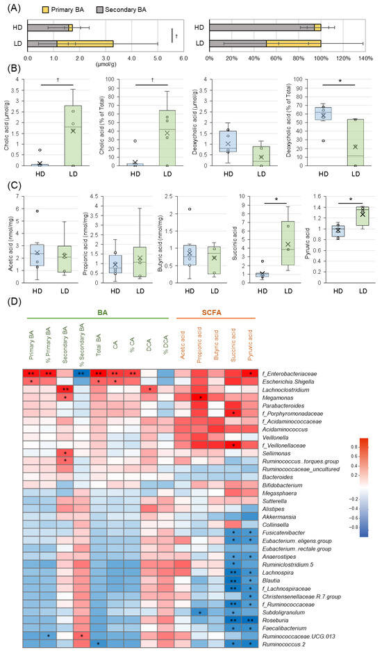 Intergroup comparisons of the fecal metabolites, BAs and SCFAs, are shown in Figure 2. Total BAs of 1.8 (0.3, 3.0) μmol/g were obtained from feces in the HD group and 3.8 (1.1, 5.0) μmol/g in the LD group, indicating higher levels in the LD group as compared to the HD group (p = 0.081, left side of Figure 2A; figures show mean ± SD, and Table S5). The HD group showed almost no primary BA and was dominated by secondary BA, whereas the LD group included more primary BA. In terms of percentage of the total, the HD group included 0 (0, 37.0)% primary BA and 100 (63.0, 100)% secondary BA, while the LD group had 56.5 (0, 92.6)% primary BA and 43.5 (6.9, 100)% secondary BA, indicating that the composition of primary and secondary BAs differed in the two groups (right side of Figure 2A). In particular, in terms of primary BAs, CA tended to be higher in the LD group in terms of both quantity and percentage of the total BA (p = 0.081, 0.081, respectively; Figure 2B). For secondary BAs, DCA was significantly lower in the LD group than in the HD group as a percentage of total BA (p = 0.020). However, no significant difference was observed between the two groups in terms of quantity (p = 0.108). In terms of the correlation between BAs and the gut microbiome (Figure 2D), f_Enterobacteriaceae showed significant positive correlation with primary BA, including CA, and total BA, and significant negative correlation with % secondary BA (p < 0.01, respectively), while secondary BA showed significant positive correlations with g_Lachinoclostridium, g_Sellimonas, and g_Ruminococcus torques group, belonging to f_Lachinospiraceae and g_Ruminococcaceae UCG013, which in turn belong to f_Ruminococcaceae and g_Megamonas (p < 0.05, respectively).