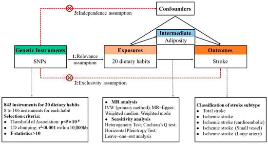 The study design is illustrated in the diagram below, which emphasizes that the causal interpretations of MR estimates depended on the three following essential assumptions [] (Figure 1): (1) the chosen IVs must be strongly associated with dietary habits; (2) these IVs should exhibit no association with any potential confounders; and (3) the IVs should influence the various subtypes of stroke exclusively through dietary habits, without involving other pathways. These principles were rigorously maintained throughout the entire study. To address potential biases that could compromise the reliability of our findings, we conducted an extensive series of downstream analyses. Specifically, we calculated F-statistics to confirm the validity of the IVs and employed Egger regression along with MR-Pleiotropy Residual Sum and Outlier (MR-PRESSO) to identify and adjust for horizontal pleiotropy and outliers. Additionally, we performed leave-one-out analysis to evaluate the influences of any predominant IVs [,,].