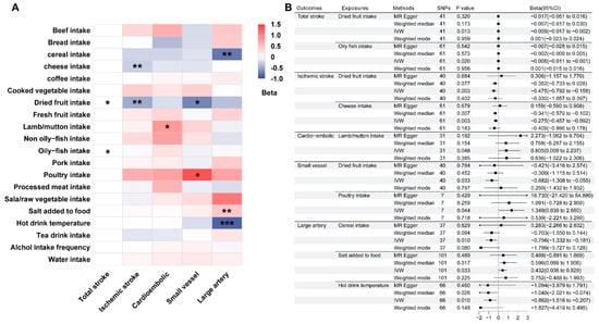 Heat map (A) and forest map (B) illustrated the statistically causal relationships between dietary habits and various subtypes of stroke, utilizing the inverse-variance weighting (IVW) approach. *: p < 0.05; **: p < 0.01; ***: p < 0.001.