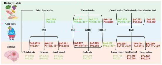 The two-step MR (TSMR) analysis revealed significant causal relationships between potential intermediates and dietary habits, as well as various subtypes of stroke. The diagram illustrated a TSMR mediation model depicting the pathway of “dietary habits–adiposity–stroke”. The beta values (β) in the diagram represent the estimated causal effects derived employing the IVW method, truncated at p < 0.05. Characters colored in red and green indicate negative and positive associations, respectively. BMI, body mass index; WHR, waist-to-hip ratio; and HDL-C, high-density lipoprotein cholesterol.