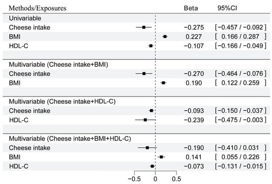 Effect of a one standard deviation (SD) increase in cheese intake on the odds of ischemic stroke in two-sample and multivariable models. Two-sample MR models provided effect estimates indicating that each SD increase in cheese intake exposure was associated with a reduction in the odds of ischemic stroke by over 0.275-fold. Multivariable models presented estimates that adjusted for additional factors; for instance, a one S.D. increase in cheese intake reduced the odds of ischemic stroke by 0.270-fold when accounting for BMI. This effect was further attenuated to 0.190-fold when both BMI and HDL-C levels were considered.