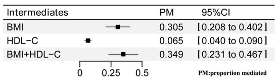 Estimates of the effect of cheese intake on ischemic stroke, delineated by each mediator and their combined influence. PM, proportion mediated.