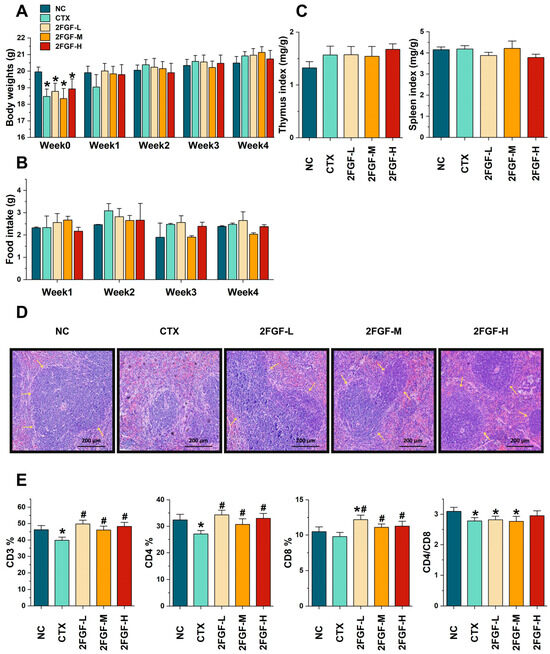 3.1.1. Effect of 2FGF on Body Weight, Food Intake, Immune Organ Indices, Histological Changes, and T Lymphocyte Subgroups