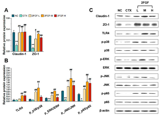 The effect of 2FGF on the protein expression of Claudin-1 and ZO-1 (A), TLR-4, p-p38, p38, p-ERK, ERK, p-JNK, JNK, p-p65, and p65 in the large intestines (ascending colon) of CTX-induced immunosuppressed mice (B), with representative Western blot images (C). Data are presented as means ± standard deviations (n = 3). Significant differences compared to the NC group are indicated by * (p < 0.05) and ** (p < 0.01), and significant differences compared to the CTX group are indicated by # (p < 0.05) and ## (p < 0.01).