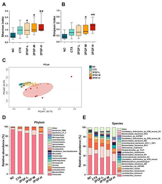 The effect of 2FGF on the Shannon index (A), Simpson index (B), PCoA analysis (C), phylum-level relative abundance (D), and species-level relative abundance (E) of the gut microbiota in CTX-induced immunosuppressed mice. Data are presented as means ± standard deviations (n = 8). Significant differences compared to the NC group are indicated by * (p < 0.05) and ** (p < 0.01).