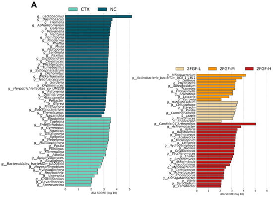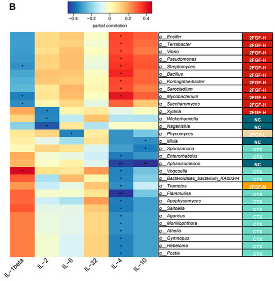 The genera enriched in the NC group, g_Wickerhamiella and g_Naganishia, were significantly negatively correlated with serum IL-2 levels, while g_Mixia and g_Aphanizomenon were significantly negatively correlated with IL-4 and IL-10 levels. The genera enriched in the CTX group, g_Sporosarcina, g_Enterorhabdus, g_Aphanizomenon, g_Vogesella, g_Bacteroidales_bacterium_ KA00344, g_Flammulina, g_Apophysomyces, g_Saitoella, g_Agaricus, g_Moniliophthora, g_Athelia, g_Gymnopus, g_Hebeloma, and g_Postia, were significantly negatively correlated with IL-4 levels. The genus enriched in the 2FGF-L group, g_Phycomyces, was significantly negatively correlated with IL-6 levels. The genus enriched in the 2FGF-M group, g_Trametes, was significantly negatively correlated with IL-4 levels. The genera enriched in the 2FGF-H group, g_Ensifer, g_Terrabacter, g_Vibrio, g_Pseudomonas, g_Streptomyces, g_Bacillus, g_Komagataeibacter, g_Sarocladium, and g_Mycobacterium, were significantly positively correlated with IL-4 levels, while g_Streptomyces, g_Mycobacterium, and g_Saccharomyces were significantly negatively correlated with IL-1β levels and g_Xylaria was significantly negatively correlated with IL-2 levels. These results suggest that 2FGF supplementation changes the composition of the gut microbiota and affects the concentration of serum cytokines.