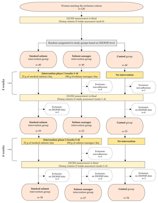 In total, 120 women met the inclusion criteria and were randomly assigned to one of three study groups (group 1—Smoked salmon group, group 2—Salmon sausage group, and group 3—Control group) with 40 participants in each group. The random assignment was performed using stratified block randomization, with stratification based on baseline 25(OH)D concentration. This allocation ensured that the baseline mean 25(OH)D concentrations were similar across the groups. Additionally, the baseline mean BMI was comparable across the groups; therefore, no further adjustments to the three study groups were made.