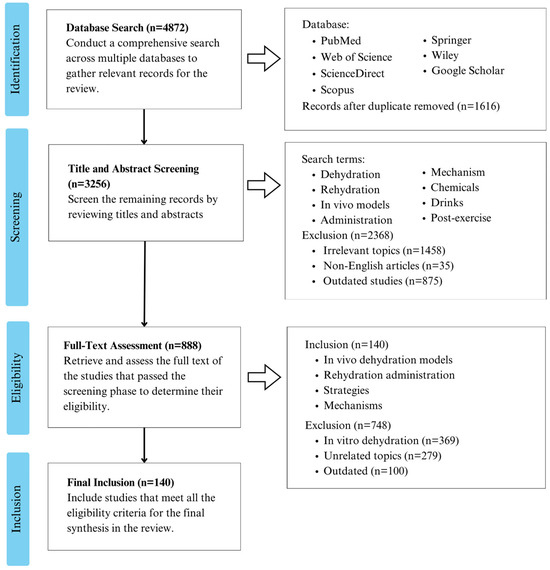 The scientific literature for this review on in vivo dehydration models and rehydration strategies was sourced from a range of databases, including PubMed, Web of Science, ScienceDirect, Scopus, Springer, Wiley, and Google Scholar. The search terms encompassed “dehydration”, “rehydration”, “in vivo models”, “administration”, “mechanism”, “chemicals”, “beverages”, and “post-exercise”. Only articles written in English were considered, with selections based on an initial review of the titles and abstracts. Potentially relevant articles were further reviewed in full to determine their eligibility. The inclusion criteria were studies that addressed in vivo dehydration models, rehydration methods, strategies, or mechanisms. The exclusion criteria included research focusing on in vitro models, irrelevant subjects, or outdated studies (Figure 1).