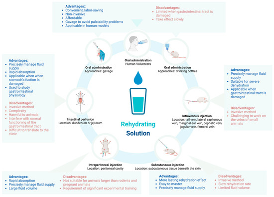 Oral rehydration is generally convenient and labor-saving [63,64]. It is noninvasive and reduces stress and discomfort for animals, while simplifying the process for researchers. Oral administration is also cost-effective, making it suitable for experiments with limited budgets [64]. Palatability issues can be managed through gavage [65], and this method is applicable for rehydration in human dehydration models as well. Overall, oral rehydration effectively meets the needs of most studies.