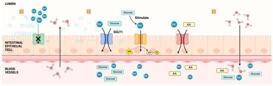 - Fordtran, J.S. Stimulation of active and passive sodium absorption by sugars in the human jejunum. J. Clin. Investig. 1975, 55, 728–737. [Google Scholar] [CrossRef] [PubMed]