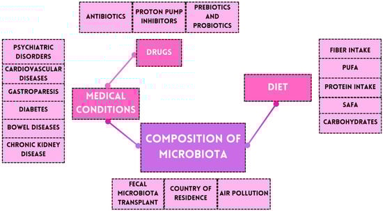 It is worth noting that the composition of the microbiota is individual and is affected by many factors, such as the country of residence and environmental pollution. Any diseases and medical conditions present are also of great importance. A summary of the factors affecting the microbiota composition in adults is shown in Figure 2 [,,,,,,,,].