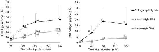- Asai, T.; Takahashi, A.; Ito, K.; Uetake, T.; Matsumura, Y.; Ikeda, K.; Inagaki, N.; Nakata, M.; Imanishi, Y.; Sato, K. Amount of collagen in the meat contained in Japanese daily dishes and the collagen peptide content in human blood after ingestion of cooked fish meat. J. Agric. Food Chem. 2019, 67, 2831–2838. [Google Scholar] [CrossRef]