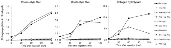 - Shigemura, Y.; Suzuki, A.; Kurokawa, M.; Sato, Y.; Sato, K. Changes in composition and content of food-derived peptide in human blood after daily ingestion of collagen hydrolysate for 4 weeks. J. Sci. Food Agric. 2018, 98, 1944–1950. [Google Scholar] [CrossRef]