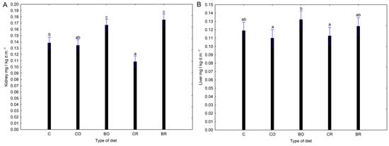 Concentration of iodine in selected organs. Contents of I in the kidney (A), contents of I in the liver (B); values in rows with different letters (a, b, c) are significantly different, p ≤ 0.05 (Duncan’s post hoc test); bars indicate standard error (n = 8). C—control diet (AIN-93G), CO—diet containing control curly kale “Oldenbor F1”, BO—diet containing biofortified curly kale “Oldenbor F1”, CR—diet containing control curly kale “Redbor F1”, BR—diet containing biofortified curly kale “Redbor F1”. Homogeneous groups refer to one-factor analysis of variance: Factor No.1 type of diet: C, CO, BO, CR, BR. The marking of the blue deviation line is the same for all experimental groups C, CO, BO, CR, BR.
