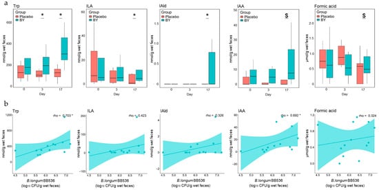 Correlation between fecal metabolite concentrations and viable B. longum BB536 counts: (a) quantitative measurements of fecal Trp, IAA, ILA, IAld, and formic acid concentrations; (b) correlation of the concentrations of the same five metabolites on day 17 and the viable B. longum BB536 count. Statistical significance is indicated as follows: $ p < 0.1; * p < 0.05; with (a) Quade’s nonparametric ANCOVA and (b) Spearman’s correlation.