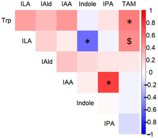 Heatmap of Spearman’s correlations among Trp metabolites on day 17. The map displays pairwise comparisons of Trp, ILA, IAA, IAld, Indole, Indole-3-propionic acid (IPA), and tryptamine (TAM) on day 17. Statistical significance is indicated as follows: $ p < 0.1; * p < 0.05.