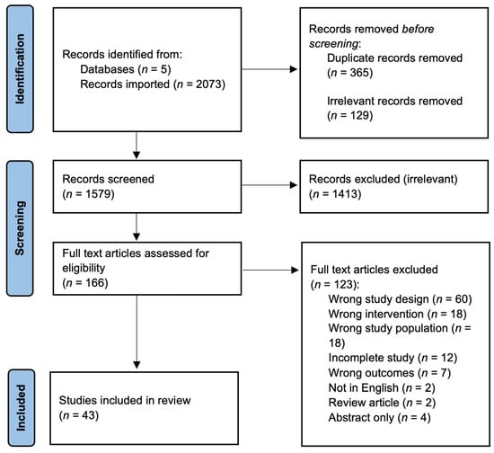 The remaining 1579 citations were uploaded to Covidence (Melbourne, Australia) for screening. Title and abstract screening was completed by two independent reviewers for each study, and consensus was reached by a third independent reviewer. The remaining 166 full-text articles were then each assessed by two independent reviewers for further eligibility based on inclusion criteria, and a third independent reviewer determined consensus (Figure 1). The screening process followed the guidelines of the Preferred Reporting Items for Systematic reviews and Meta-Analyses (PRISMA), which is displayed in the PRISMA flow diagram (Figure 1). From this, 43 studies met the eligibility requirements and were used for analysis in the scoping review. Data from these 43 studies were extracted using the Qualtrics XM survey tool (Provo, UT, USA). Each study was extracted by two reviewers, and any discrepancies were settled by a third reviewer.
