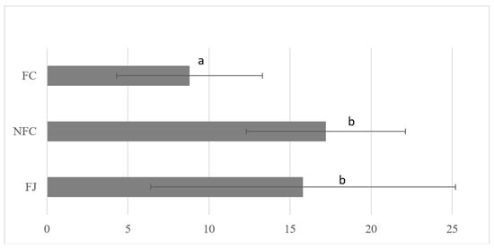 Considering the purchasing location, juices sold in France had the highest values (19.55 µg 5-MTHF/100 mL on average), mostly NFC, while those sold in Germany had the lowest (4.75 µg 5-MTHF/100 mL on average), being all of them FC. In the case of the individual commercial orange juices (FC) sold in Germany, no significant differences (p > 0.05) were found between samples except for GJ5C. Samples purchased in Spain were NFC and FC, with no significant differences (p > 0.05) among them except for SJ5C. Interestingly, the highest folate contents were found in two fresh orange juice samples, SFSJ4 (25.51 µg 5-MTHF/100 mL) and SFSJ1 (23.86 µg 5-MTHF/100 mL), followed by the commercial orange juices purchased in France (17.25–23.19 µg 5-MTHF/100 mL) and the UK (13.45–21.13 µg 5-MTHF/100 mL). These values are in the range reported by Delchier et al. (2016) and Öhrvik et al. (2008) [,].