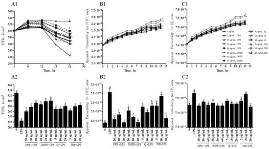 The effect of OPE, DOPE, Q, and DQ on transepithelial electrical resistance (TEER) and intestinal paracellular permeability in Caco-2/HT-29 cells. Caco-2/HT-29 cells were treated with OPE, DOPE, Q, and DQ for 12 h and then were induced by LPS together with OPE, DOPE, Q, or DQ for the next 12 h. (A1) TEER of cell monolayers from Caco-2/HT29 cells was determined every 6 h for 24 h of the sample treatment. (A2) TEER of cell monolayers from Caco-2/HT29 cells at the endpoint (24 h) of the sample treatment. (B1) Permeability was determined by measuring FITC-dextran that passed through the Caco-2/HT-29 every hour for 12 h after LPS and sample treatment. (B2) Permeability of FITC-dextran at the 12 h endpoint from the LPS and sample treatment. (C1) Permeability was determined by measuring the LY that passed through the Caco-2/HT-29 every hour for 12 h after LPS and sample treatment. (C2) Permeability of LY at the 12 h endpoint from the LPS and sample treatment. The experiment was performed in quadruplicate. Alphabetic letters indicate a significant difference (p < 0.05) between treatments.
