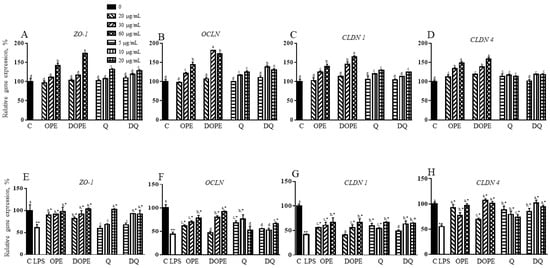 LPS suppressed tight junction genes (Figure 2E–H). LPS suppressed the ZO-1 gene by 39%, which was reversed to the control level by OPE and DOPE (Figure 2E). OPE showed better protection than DOPE at 20 µg/mL. DQ at 10 and 20 µg/mL reversed the LPS-suppressed ZO-1 gene to the control, but Q showed the same effect at only 20 µg/mL. LPS-suppressed OCLN exhibited a 40%, 60%, and 77% increase by 20, 30, and 60 µg/mL OPE (Figure 2F). DOPE at 30 µg/mL increased OCLN gene expression by 80%. DOPE at 60 µg/mL protected the LPS suppression. The gene was also induced by 56% and 75% by 5 and 10 µg/mL Q, but it was not changed by 20 µg/mL Q. DQ at 20 µg/mL increased the OCLN gene by 22%. LPS suppressed the CLDN 1 gene by 59% (Figure 2G). OPE and DOPE at 60 µg/mL similarly increased CLDN 1 by 60%. Q at 5 and 20 µg/mL and DQ at 5 and 20 µg/mL also showed a similar increase. LPS-suppressed CLDN 4 gene was protected by OPE at 20 and 60 µg/mL and OPE at 30 and 60 µg/mL (Figure 2H). The gene was significantly increased by 61%, 44%, and 34% and 54%, 86%, and 71% by 5, 10, and 20 µg/mL of Q and DQ, respectively.