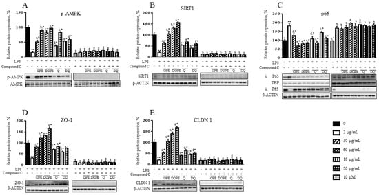 The effect of OPE, DOPE, Q, and DQ on proteins related to TJ and inflammatory regulation in LPS-induced Caco-2/HT-29 cells. (A) p-AMPK, (B) SIRT1, (C) NF-κB p65, (i) the nucleus and (ii) cytoplasm, (D) ZO-1, and (E) CLDN1 proteins were determined in the LPS-induced Caco-2/HT-29 cells with or without compound C (dorsomorphin). The lower panel of each graph shows a representative western blot image. (A) The p-AMPK was normalized by AMPK. (B) SIRT1, ZO-1, and CLDN were normalized by β-ACTIN. Nuclear and cytosolic p65 proteins were normalized by TBP and β-ACTIN, respectively. Alphabetic letters indicate a significant difference (p < 0.05) between treatments. ** control vs. LPS, * LPS vs. treatment.