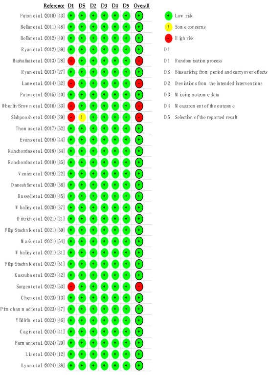 - Sterne, J.A.C.; Savović, J.; Page, M.J.; Elbers, R.G.; Blencowe, N.S.; Boutron, I.; Cates, C.J.; Cheng, H.-Y.; Corbett, M.S.; Eldridge, S.M.; et al. RoB 2: A revised tool for assessing risk of bias in randomised trials. BMJ 2019, 366, l4898. [Google Scholar] [CrossRef]
