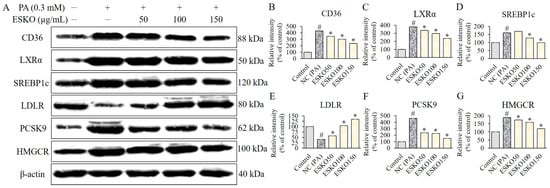 3.4. Effect of ESKO on CD36, LXRα, SREBP1c, LDLR, and PCSK9 Signaling and HMGCR Activity in HepG2 Cells