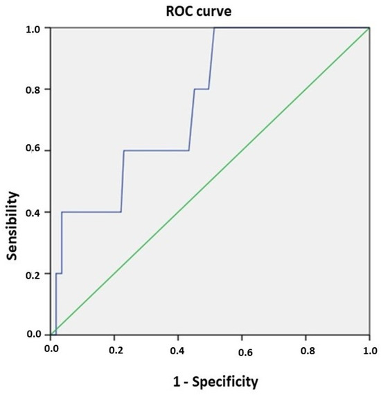 Postoperative mortality was also associated with higher BUN levels (44.1 ± 18.4 mg/dL in the patients who died vs. 30.4 ± 12.4 mg/dL in the patients who survived; p = 0.02). BUN values > 28.9 mg/dL had a sensitivity of 80% and a specificity of 54.9% for predicting postoperative mortality (AUC 0.755; CI95% (0.57–0.94); p = 0.05) (Figure 1).