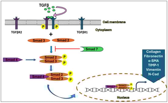 Activation of the components of the TGFβ/Smad canonical signaling pathway initiates the fibrosis process by inducing transcription of the downstream fibrotic genes. Abbreviations: α-SMA—alpha-smooth muscle actin, TIMP—tissue inhibitors metalloproteinases, N-Cad—Neural cadherin.