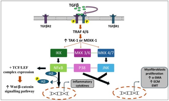 Activation of TGF-β stimulates NFκB and MAPK signaling pathways with the subsequent activation of the Wnt/β-catenin pathway. Abbreviations: TRAF—TNF receptor associated factor, TAK1—transforming growth factor-β activated kinase 1, MEKK1—mitogen-activated protein kinase kinase1, IKK—inhibitor of nuclear factor-κB (IκB) kinase, MKK—mitogen-activated protein kinase kinase, IKβ—I-kappaB kinase, ECM—extracellular matrix, EMT—epithelial–mesenchymal transition (↑—increased).
