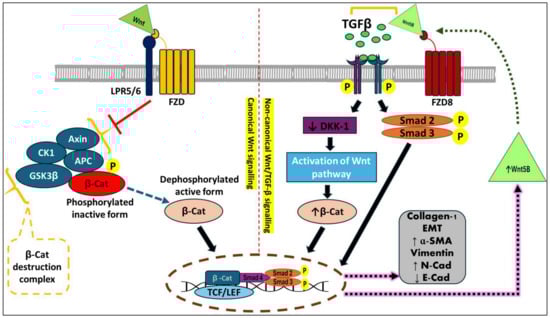 Interaction between non-canonical Wnt/β-catenin and TGFβ/Smad signaling pathways to stimulate the fibrogenesis process and transcription of the downstream fibrotic genes. Abbreviations: DKK1—Dickkopf WNT signaling pathway inhibitor 1, β-Cat—β-catenin, EMT—epithelial–mesenchymal transition, N-Cad—neural cadherin, E-Cad—epithelial cadherin. (↑—increased; ↓—decreased).