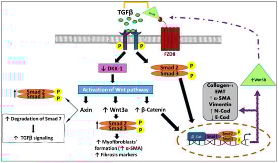 When TGF-β and Wnt are stimulated, axis inhibition protein (Axin) induces Smad 2/3 binding to the TGFβ-R1 and allows its phosphorylation []. Then, the canonical Wnt ligands, particularly Wnt3a, activate Smad2 in a β-catenin-dependent mechanism to promote TGF-β1 expression and Smad2/3 phosphorylation, resulting in EMT and the transformation of fibroblasts into myofibroblasts [,]. Additionally, Axin boosts Smad7 degradation in response to Wnt activation and, as previously indicated, Smad7 is essential to antagonize the TGF-β signaling (Figure 4) [].