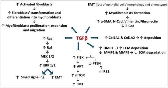 Likewise, miRNA-21 is considered a profibrogenic molecule. TGF-β plays an important role in driving the maturation and the action of miR-21. When the TGF-β/Smad signaling pathway is activated, the translocation of the p-Smad2/3 and Smad4 complex into the nucleus promotes the pri-miR-21 conversion into pre-miRNA-21, which is then released as mature miR-21. This miR-21 suppresses Smad7, resulting in the TGF-β/Smad signaling pathway activation that initiates the fibrogenesis process []. Additionally, the upregulation of miR-21 results in the downregulation of PTEN, which serves as a negative regulator of the PI3K/AKT/mTOR pathway. Consequently, the mTOR pathway will be activated uncontrollably so as to enhance the EMT process and fibrosis [].