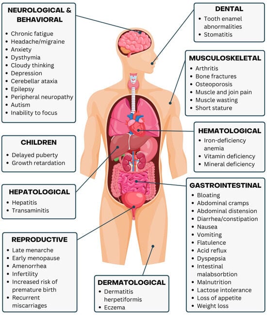 - Mouslih, A.; Rhazi, K.; El Bahra, N.; Idrissi, M.L.; Hida, M. Gluten-Free Diet Compliance in Children with Celiac Disease and Its Effect on Clinical Symptoms: A Retrospective Cohort Study. Cureus 2023, 15, e50217. [Google Scholar] [CrossRef] [PubMed]