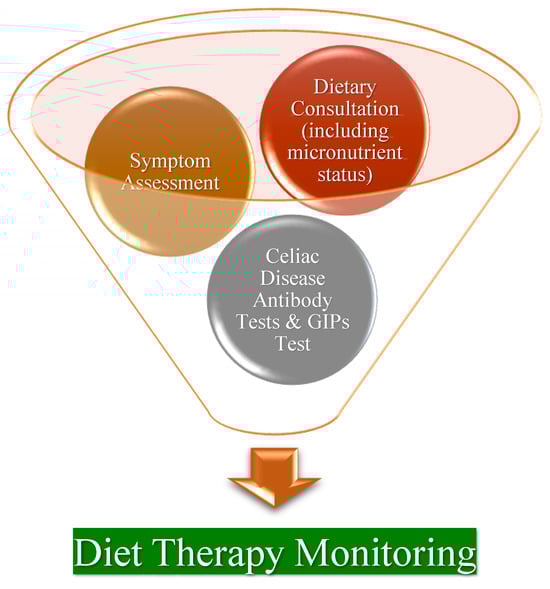 - Rubio-tapia, A.; Schumann, M.; Tye-din, J.; Zeitz, J.; Al-toma, A. Follow-Up of Celiac Disease in Adults: “When, What, Who, and Where”. Nutrients 2023, 15, 2048. [Google Scholar] [CrossRef]