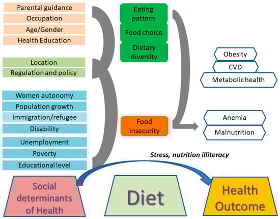 Jiao, L. Social Determinants of Health, Diet, and Health Outcome. Nutrients 2024, 16, 3642. https://doi.org/10.3390/nu16213642